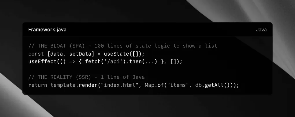 I realized that for 90% of the web, the browser shouldn’t be a heavy application engine; it should be a document viewer. By rendering HTML on the server—using my Java backend and simple templates—I eliminated the ‘Loading…’ spinner culture.